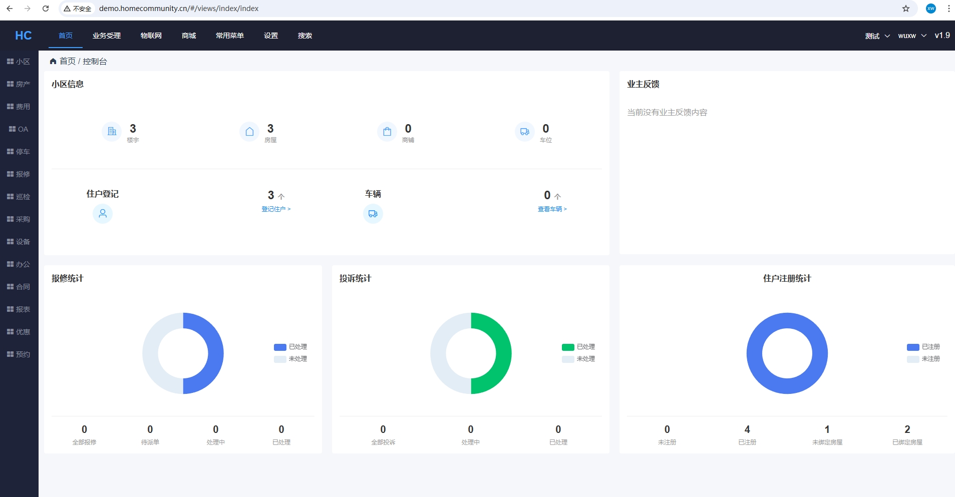 HC小区管理系统是一套saas物业管理的系统包括 房产、业主、 费用 (可以线上缴费)、报修(可以线上报修)、投诉建议、采购、巡检、停车、门径、道闸、监控、工作流、问卷和公告等功能。